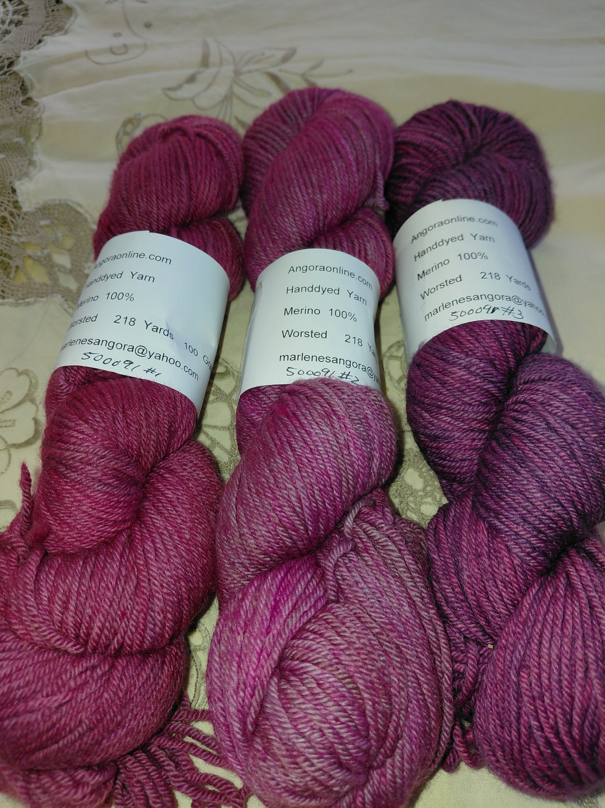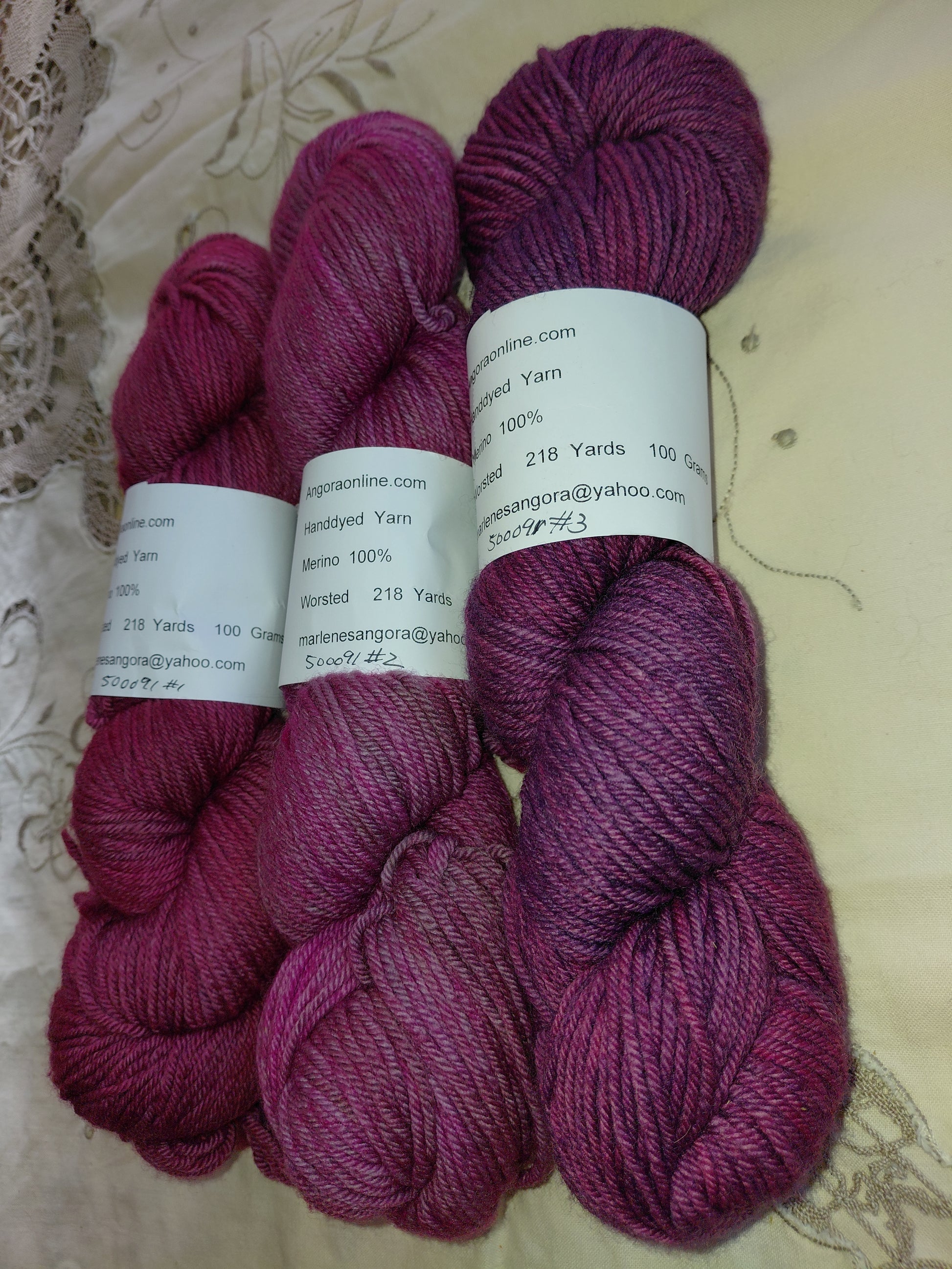 Ready to Ship Three skeins available, each in a unique tonal variation: • Skein 1: Dark pink • Skein 2: Rose pink • Skein 3: Burgundy