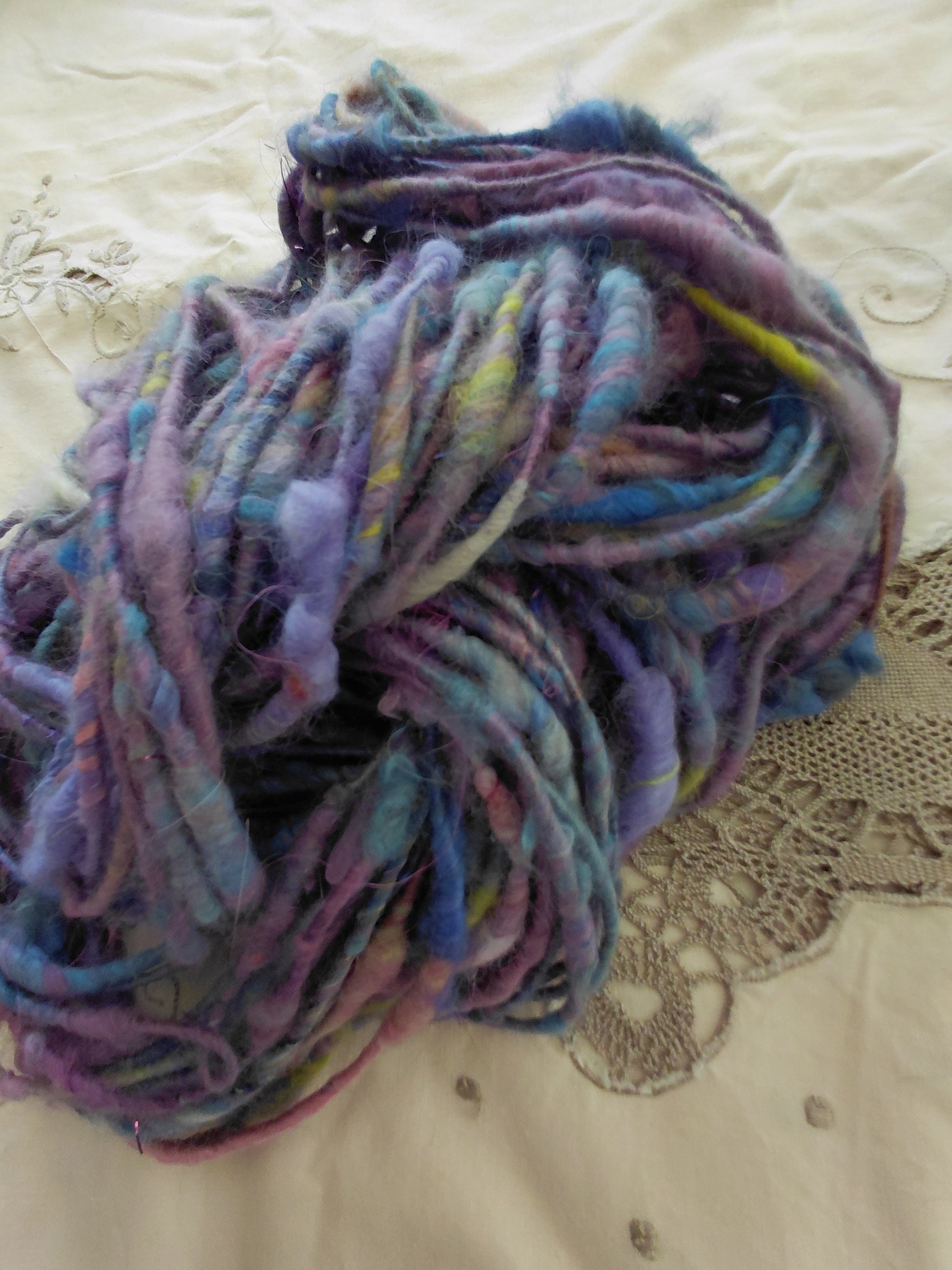 Discover the luxurious softness of this handspun angora merino art yarn, expertly corespun for exceptional durability and texture. Each 48-yard skein features a beautiful thick-and-thin bulky weight profile in a dreamy palette of soft mauve pinks, purples, light blues, white.