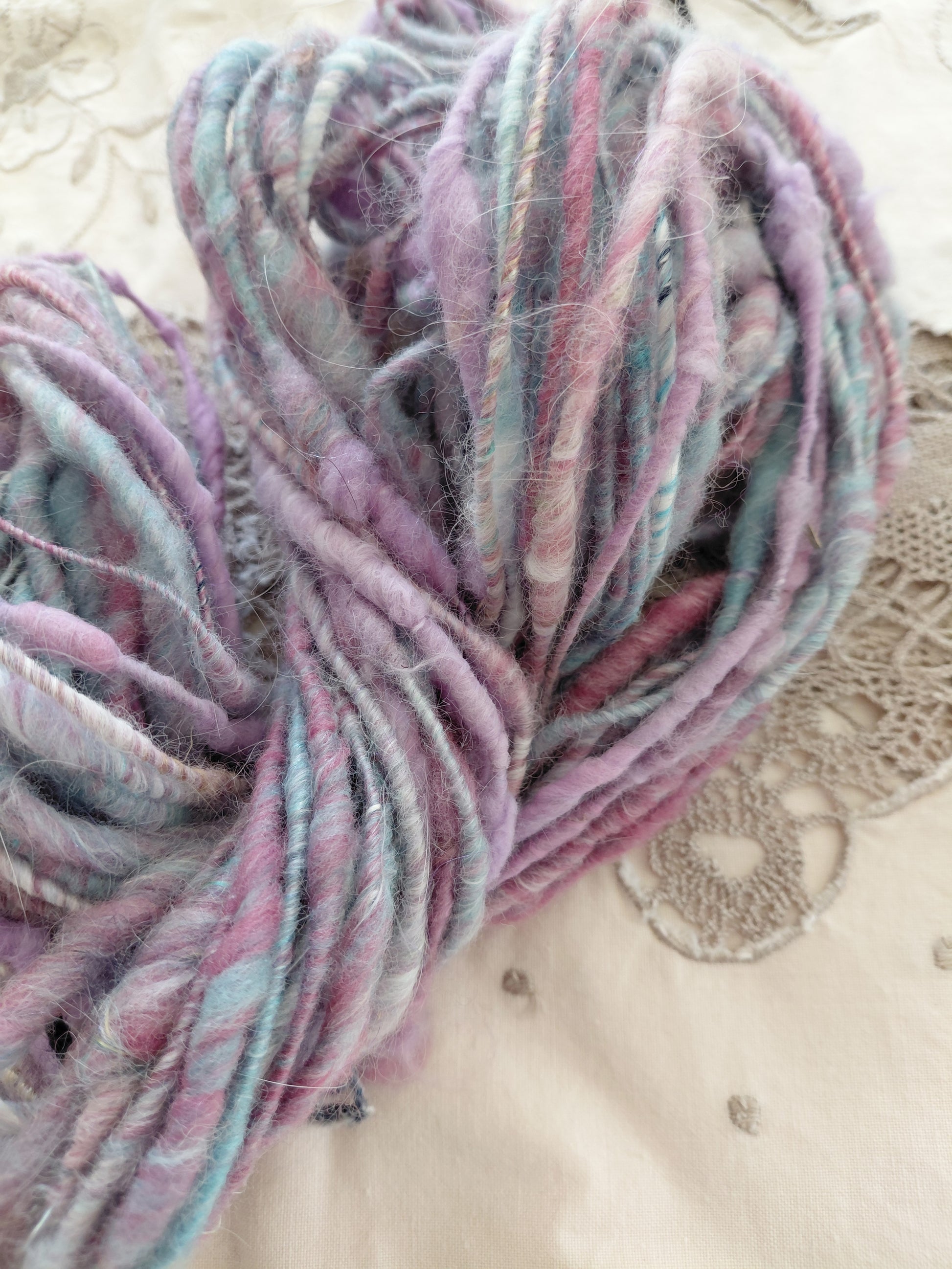 Discover the luxurious softness of this handspun angora merino art yarn, expertly corespun for exceptional durability and texture. Each 34-yard skein features a beautiful thick-and-thin bulky weight profile in a dreamy palette of soft mauve pinks, purples, light blues, white.