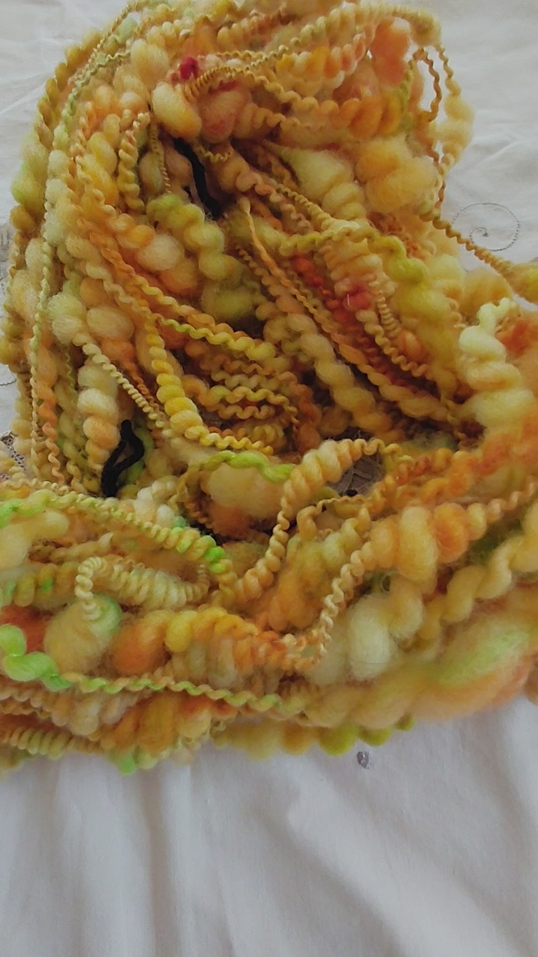 Handspun hand dyed coil yarn. This is a handspun Coiled & Spiral yarn was spun from soft B.F.L. wool, hand dyed in shades of pumpkin, gold and green then plied with a gold Silk thread to create the spiral coils, yarn is super bulky weight, 40 yards. A very soft and fluffy art yarn. These Art yarns are completely hand made and in limited quantity because it is handmade. I have other Art Yarn take a look at them if your interested.
