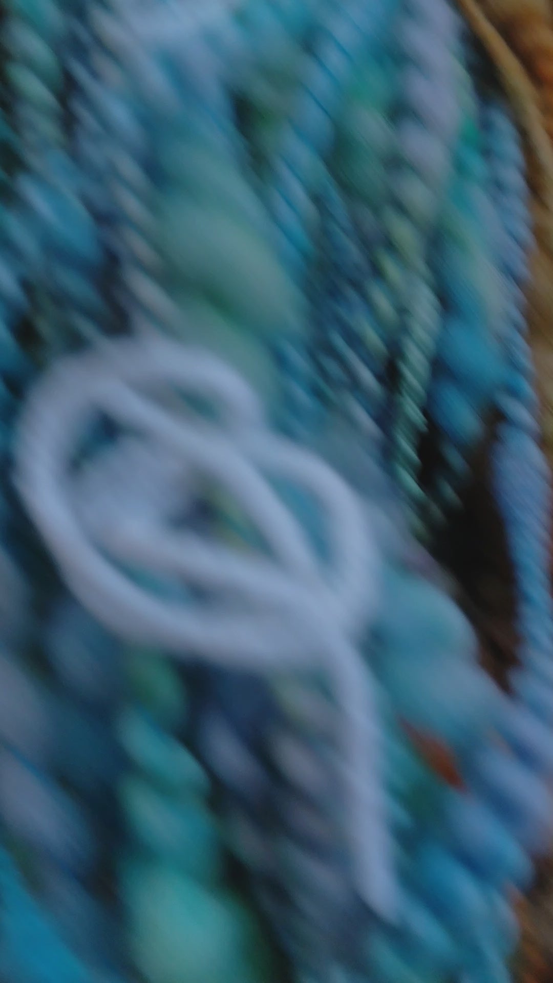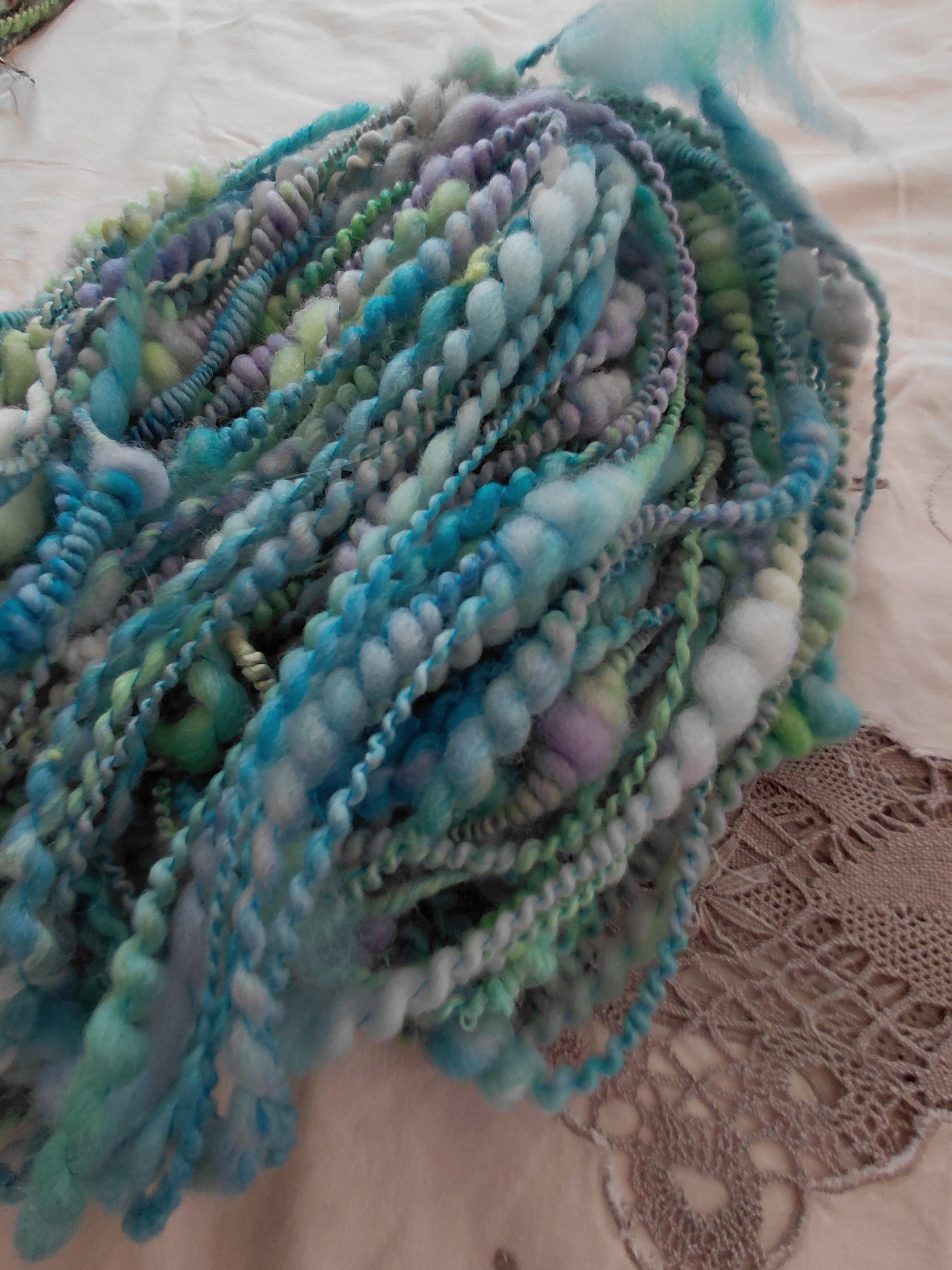 Handspun hand dyed coiled/ Spiral yarn. This is a handspun Coiled & Spiral yarn was spun from soft B.F.L. wool, hand dyed in shades of light blue, lilac, turquoise and light green then plied with a green Silk thread to create the spiral coils, yarn is super bulky weight, 48 yards. A very soft and fluffy art yarn. These Art yarns are completely hand made and in limited quantity because it is handmade. I have other Art Yarn take a look at them if your interested.