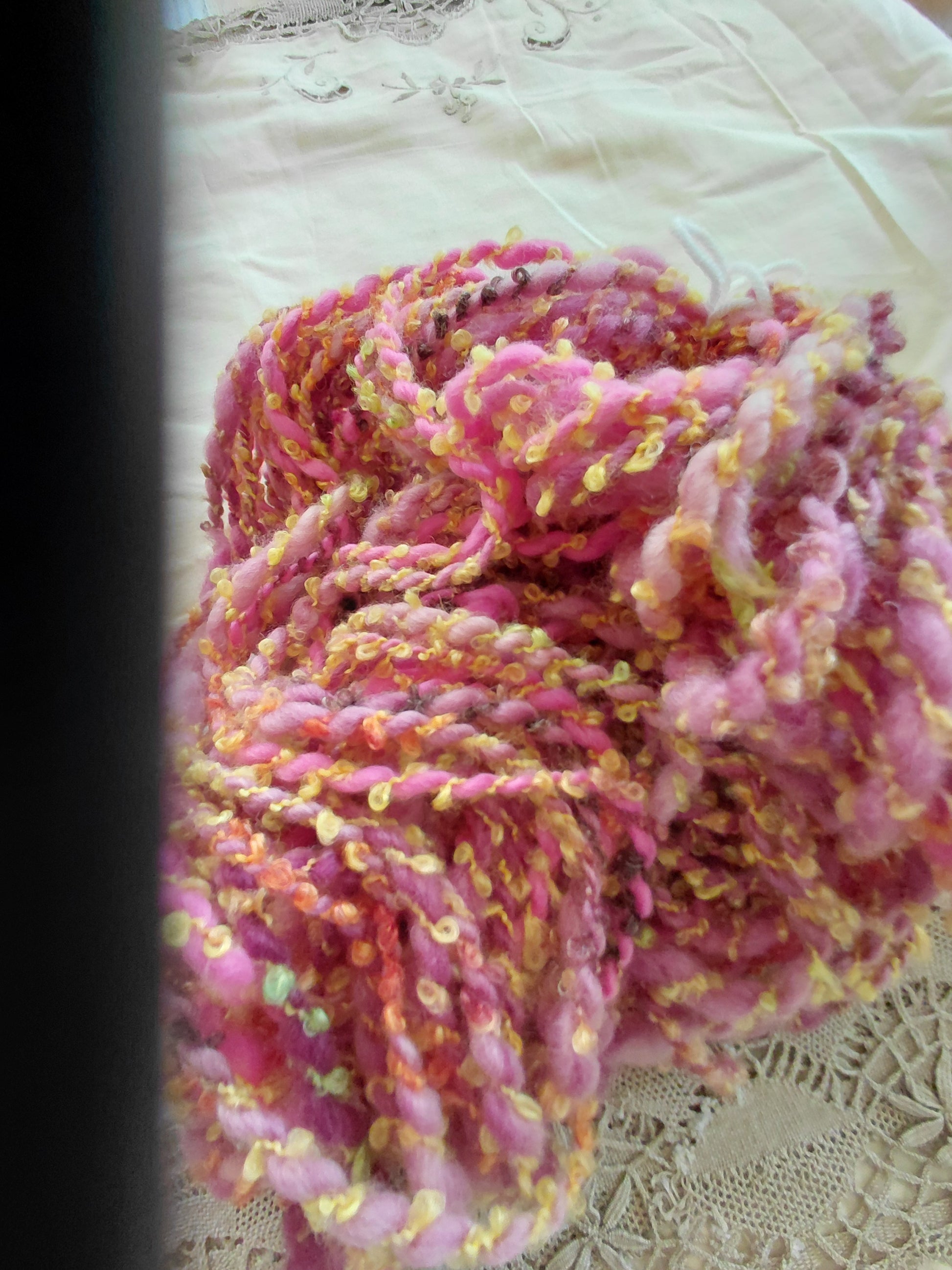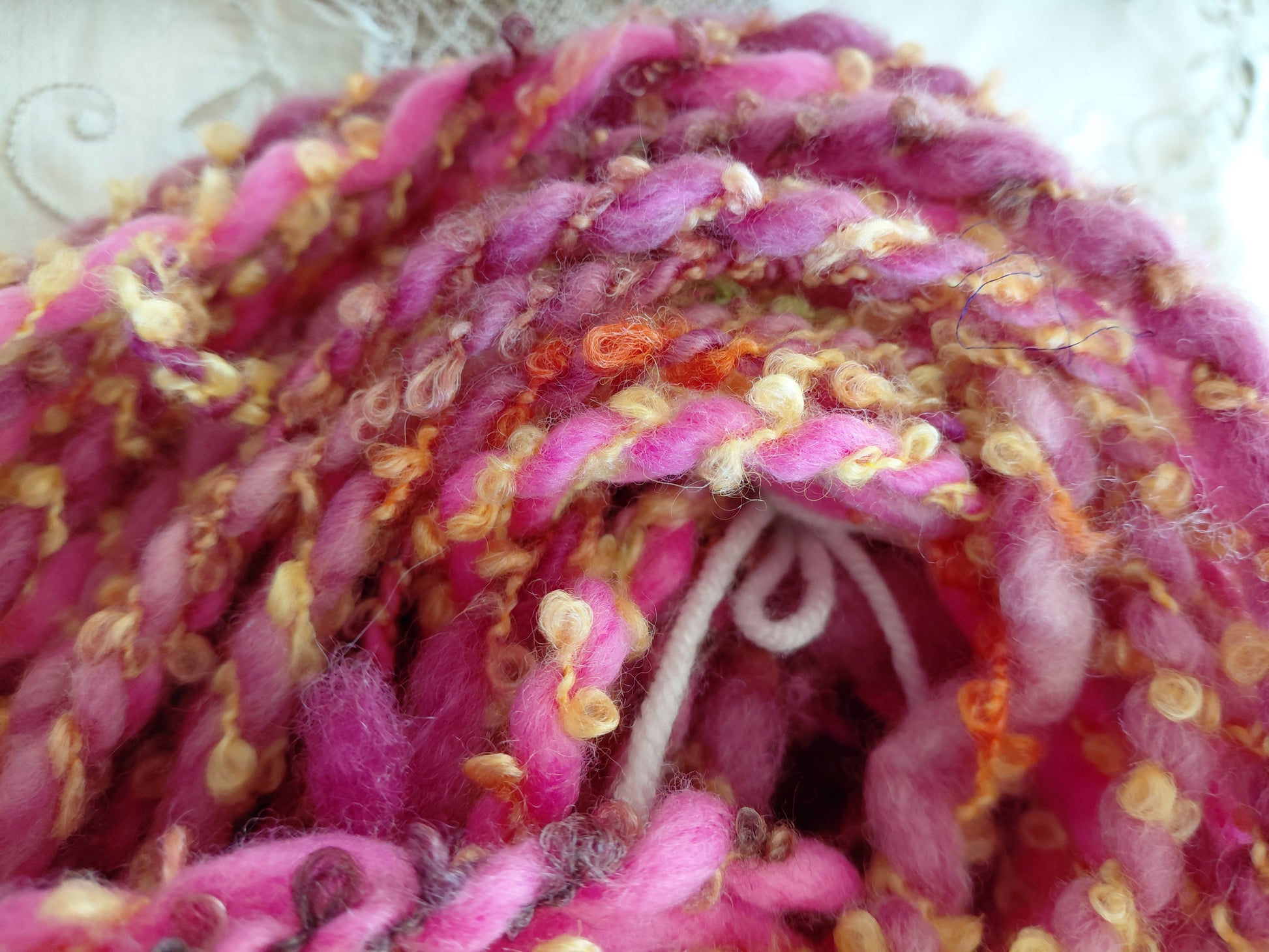 Luxuriously soft handspun art yarn featuring a unique blend of merino, silk, and alpaca fibers, hand-dyed in rich, vibrant colors: mauve pink, burgundy, yellow, gold, brown, light green. This artisan yarn combines a textured bouclé strand plied with smooth merino for exceptional depth and visual interest. I have other art yarns available, there is a picture of some of them included.