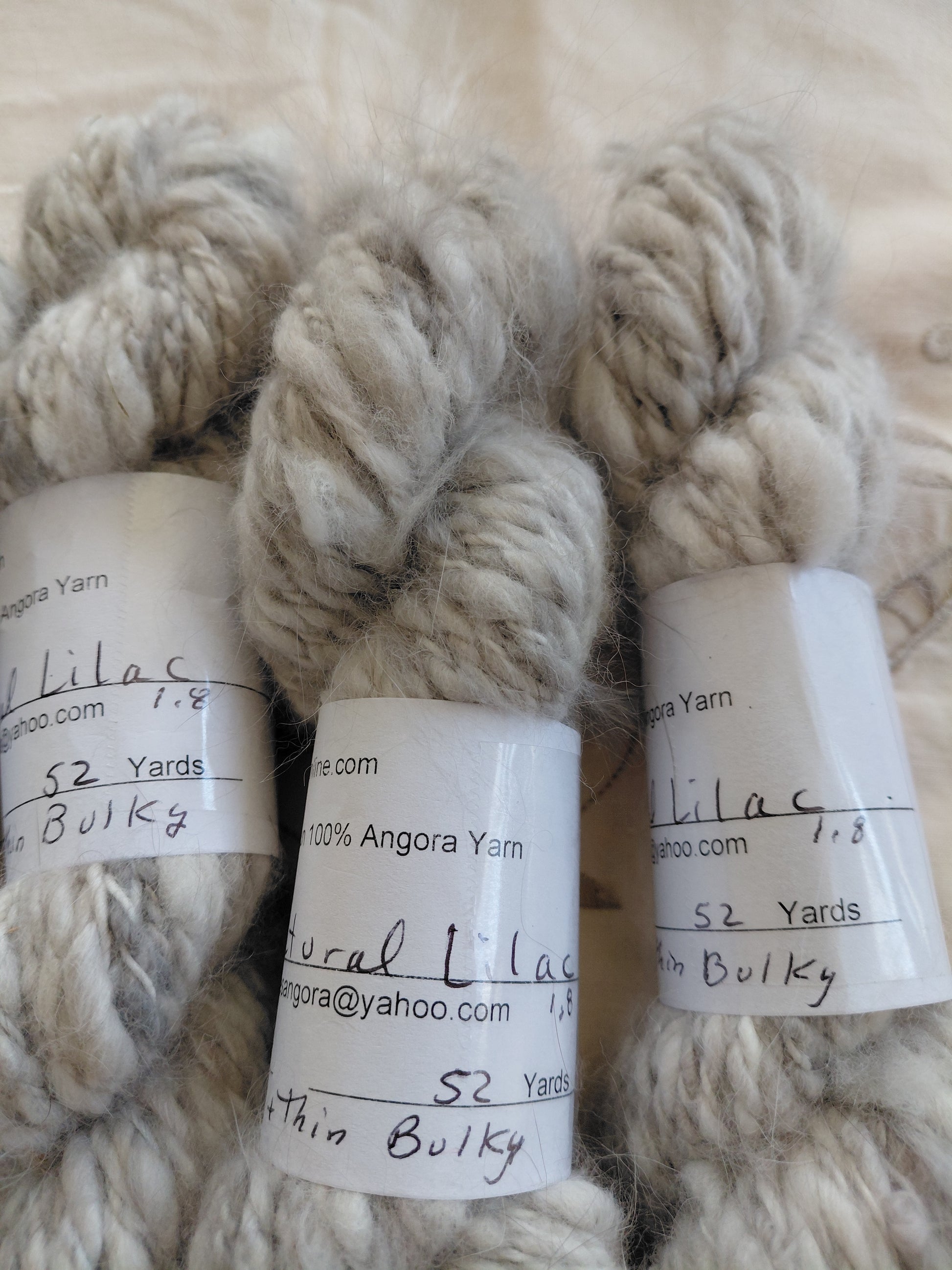 Handspun Natural Lilac 100% angora yarn. This angora yarn is thick and thin, 2-ply, bulky to super bulky weight. 4 skeins are 52 yards , 1 skein is 72 yards. I included a picture of a natural lilac so you can see how the color looks.